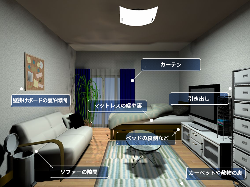 ベッドや布団の縁や裏、ソファーや家具などの裏側・隙間、カーテン、コンセントの内部、壁に掛けた絵やカレンダーの裏側や隙間、カーペットなどの敷物の裏、本などのあらゆる隙間に潜り込みます。